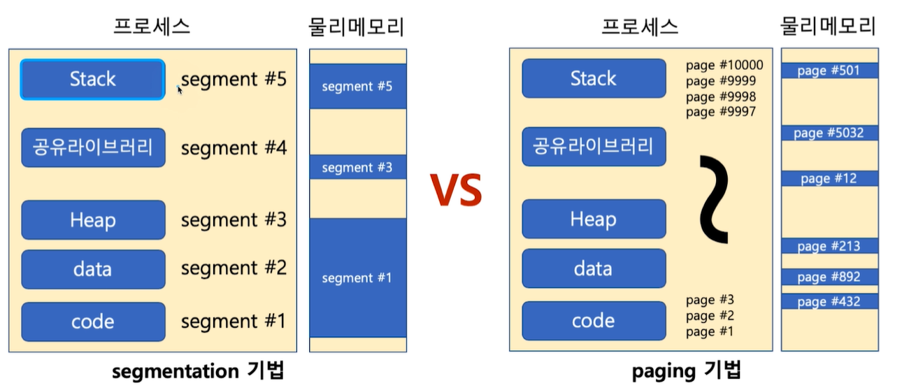 세그멘테이션은 크기가 다른 segment 단위로 물리 메모리에 로딩