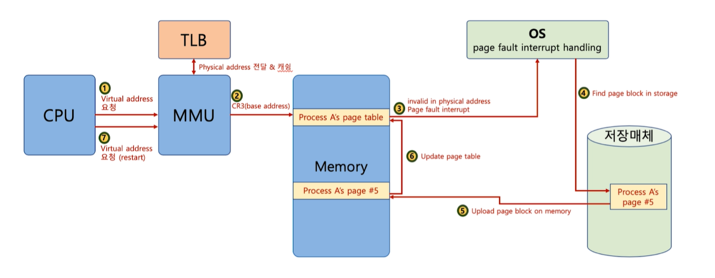 가상 주소에 매칭되는 물리 주소를 알아 낸 다음 해당 실제 물리 메모리내의 정보를 얻고 CPU에서 처리한다.