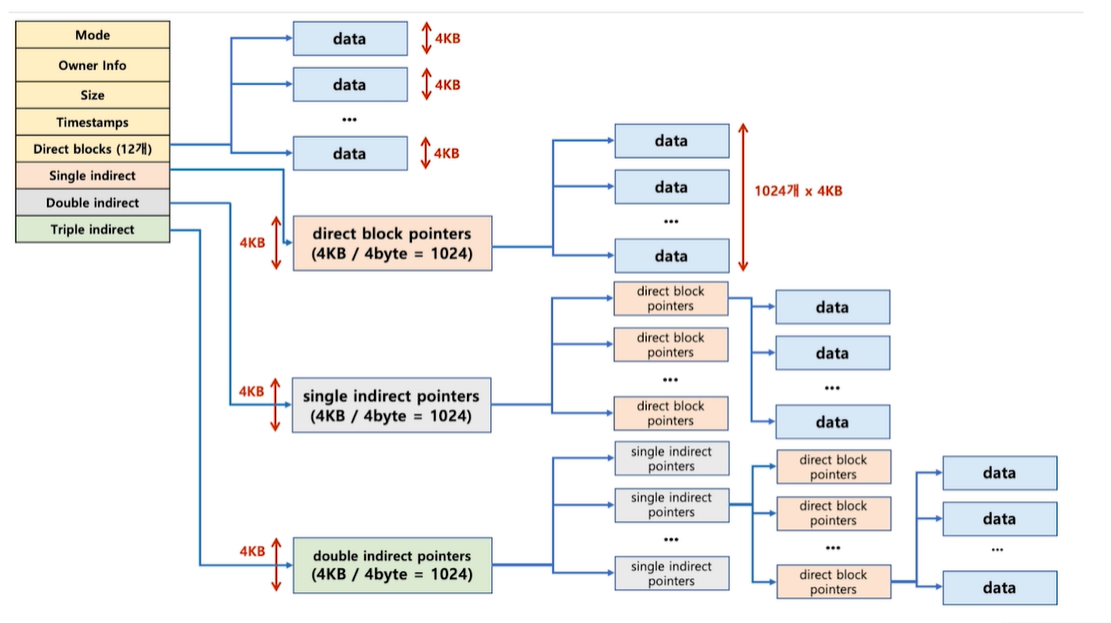 direct block pointers 각각의 주소가 4 byte로 표현이 된다고 한다면 4KB를 4 byte로 나눠서
