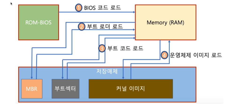 BIOS가 특정 저장매체(Storage)를 읽어와 Bootstrap loader를 메모리에 올리고 실행함