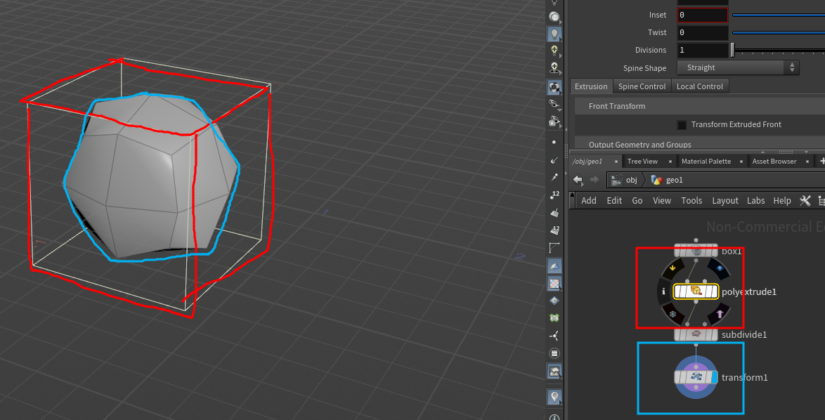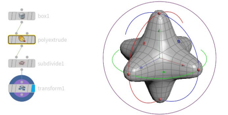 그러면 polyextrude node 의 distance parameter 와 같은 선택한 노드에 대한 특정 매개변수에 초점을 맞춘 핸들이 나타납니다.