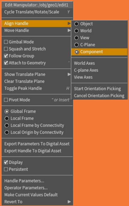 이 메뉴에서는 핸들 정렬, 노드의 파라미터에서 분리, 피벗 모드 등에 대한 옵션을 제공합니다.